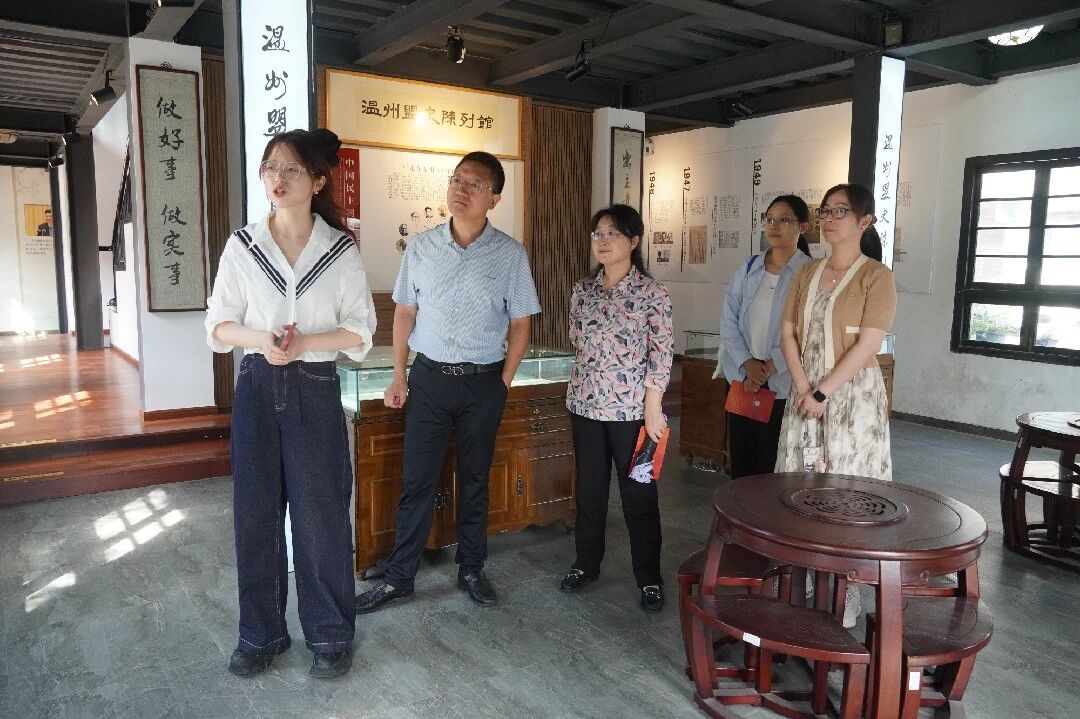 温州盟史陈列馆位于鹿城区蛟翔巷,是浙江省盟员传统教育基地。在温州盟史陈列馆,齐慧文与盟员讲解员林翔翔互动交流,查阅场馆展陈图片、实物等资料,全面了解温州民盟成立和发展历程及多位温籍民盟先贤事迹。