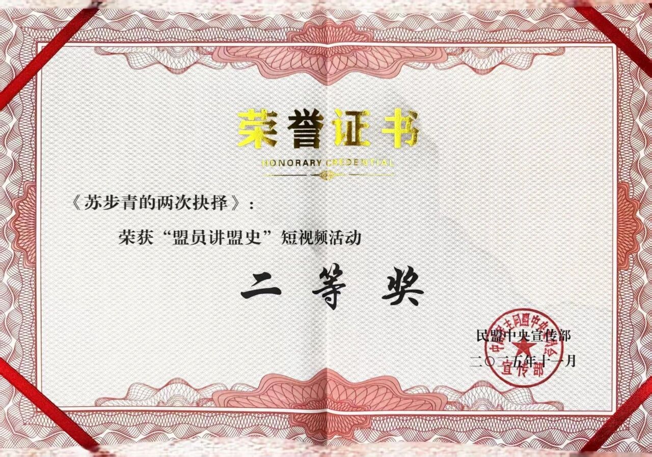 会议期间为活动获奖优秀作品及先进集体颁奖。其中,由民盟温州市委会选送,盟员池文文讲述的短视频作品《苏步青的两次抉择》荣获二等奖。