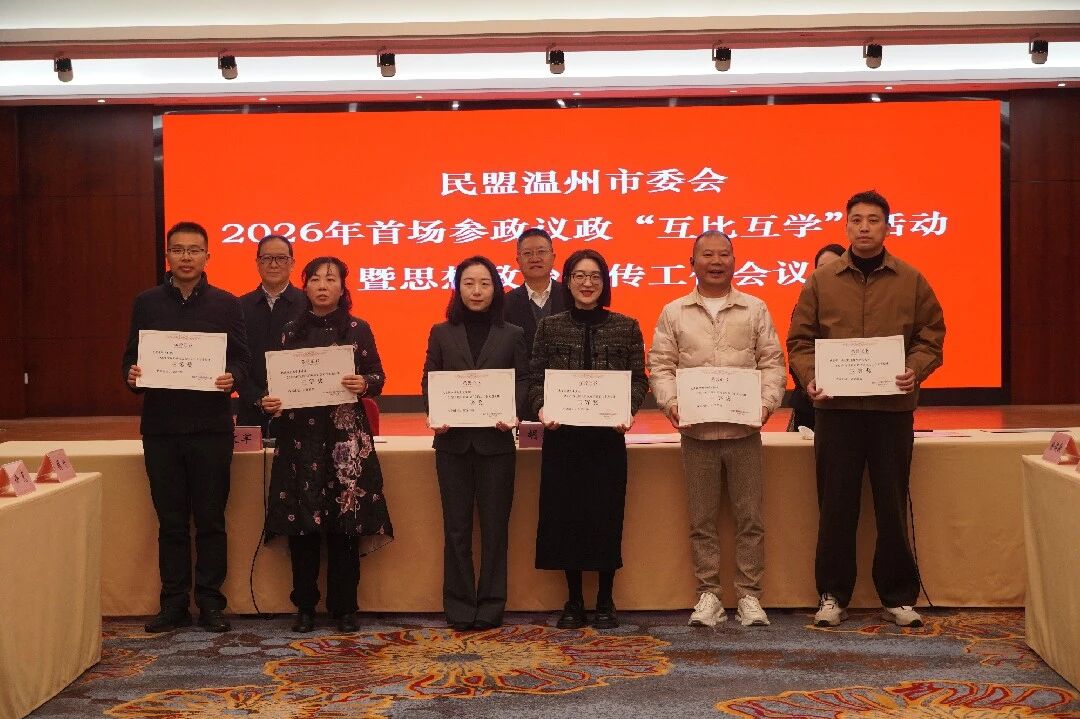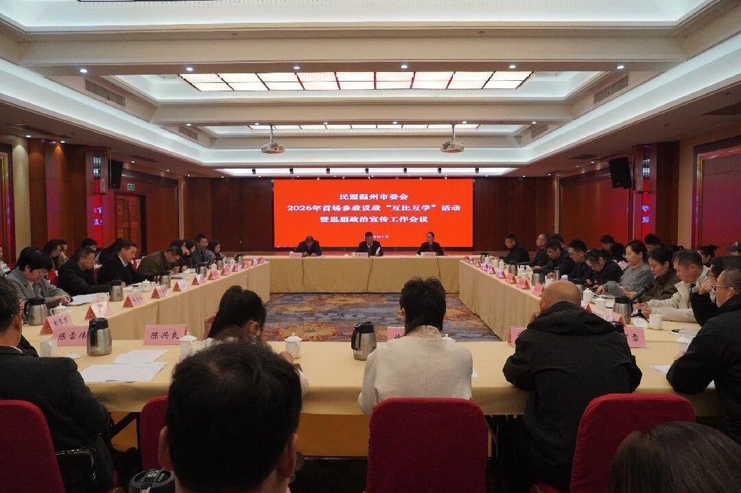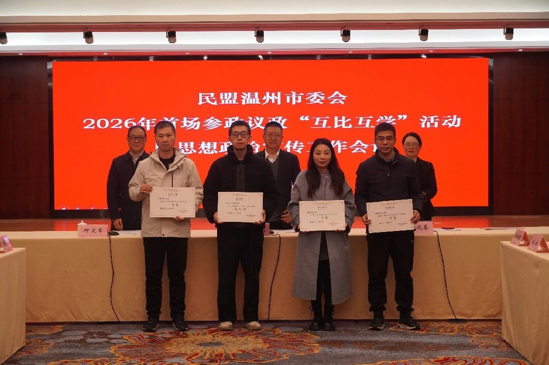 1月14日上午,民盟温州市委会举办2026年首场参政议政“互比互学”活动暨思想政治宣传工作会议。市政协副主席、民盟温州市委会主委胡荣党出席并讲话。民盟温州市委会副主委胡迎春、何文军出席会议。