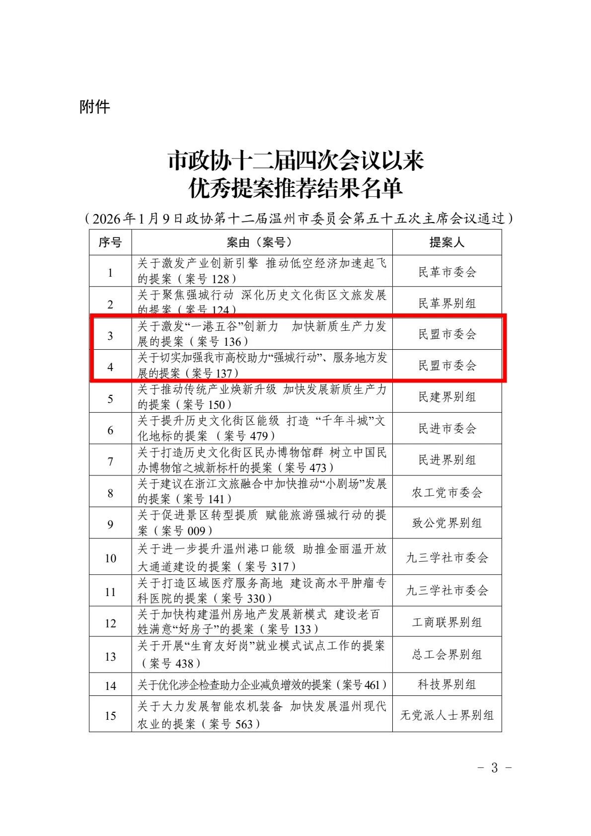 日前,市政协发文通报了市政协十二届四次会议以来优秀提案。其中,民盟温州市委会3件提案光荣上榜!